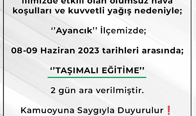 Sinop'un Ayancık ilçesinde olumsuz hava şartları nedeniyle 8-9 Haziran tarihlerinde taşımalı eğitime 2 gün ara verildi.Sinop Valiliğinden yapılan açıklamada, "İlimizde etkili olan olumsuz hava koşulları ve kuvvetli yağış nedeniyle 'Ayancık' ilçemizde 8-9 Haziran tarihleri arasında taşımalı eğitime 2 gün ara verilmiştir" denildi.