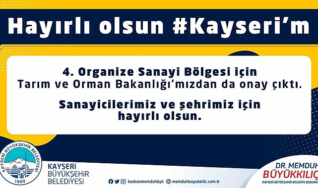 Kayseri Büyükşehir Belediye Başkanı Dr. Memduh Büyükkılıç, ticaretin, endüstrinin ve sanayinin merkezi Kayseri'ye bir müjde paylaşarak, "4'üncü Organize Sanayi Bölgesi için Tarım ve Orman Bakanlığı'mızdan da onay çıktı. Şehrimize ve sanayicimize hayırlı olsun" dedi.