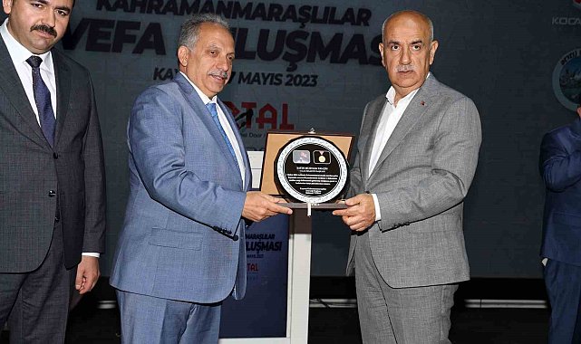 Talas Belediyesinin 6 Şubat'ta Kahramanmaraş merkezli meydana gelen depremlerden sonra bölgeye yaptığı yardımlar takdir gördü. Kahramanmaraşlılar Sosyal Yardımlaşma ve Dayanışma Derneği tarafından düzenlenen 'Vefa Buluşması'nda Talas Belediye Başkanı Mustafa Yalçın'a kendisi de Kahramanmaraşlı olan Tarım ve Orman Bakanı Prof. Dr. Vahit Kirişçi tarafından plaket verildi.Kahramanmaraşlılar Sosyal Yardımlaşma ve Dayanışma Derneği tarafından düzenlenen törene Milli Savunma Bakanı Hulusi Akar ile Tarım ve Orman Bakanı Vahit Kirişçi'nin yanı sıra şehir protokolü ve Kayseri'de yaşayan Kahramanmaraşlılar katıldı.Programın açılışında konuşan Kahramanmaraşlılar Sosyal Yardımlaşma ve Dayanışma Derneği Başkanı Mehmet Topal, depremin meydana geldiği andan itibaren desteklerini hiç kesmeyen Başkan Yalçın ve ekibine teşekkür etti. Elbistan'a kurulan 310 konteynerlik Talas Kent Yaşam Alanı'nın örnek bir uygulama olduğuna dikkat çeken Dernek Başkanı Topal, her yönüyle mükemmel bir yaşam alanı kurulduğuna işaret etti.Teşekkür plaketini Tarım ve Orman Bakanı Vahit Kirişçi'nin elinden alan Başkan Yalçın, 'Vefa Buluşması' ile Kayseri'de yaşayan Kahramanmaraşlılarla bir araya gelmekten duyduğu memnuniyeti belirterek, "İlk günden itibaren yaraların sarılması adına yanında olduğumuz depremzede kardeşlerimize sağladığımız destekler için tarafıma takdim edilen plaketten dolayı Sayın Bakanıma ve kıymetli Kahramanmaraşlılara teşekkür ediyorum. Rabbim bir daha böyle acılar yaşatmasın. Çok uzun yıllardır bu şehirde birlikte yaşadığımız Kahramanmaraşlı kardeşlerimizle olan birlik ve beraberlimizi de daim eylesin" dedi.
