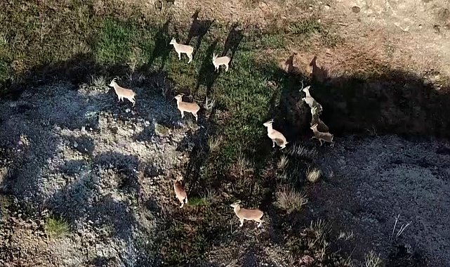 Sivas'ta bir doğa tutkunu, dağlık alanda gezdiği sırada fark ettiği 10 tane yaban keçisini dron ile kayıt altına aldı.