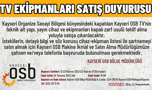 Kayseri Organize Sanayi Bölgesi bünyesinde kurulan ancak yönetim kurulu kararınca kapatılan Kayseri OSB TV'nin teknik alt yapı yayın cihaz ve ekipmanları kapalı zarf usulü teklif alma yoluyla satışa çıkarılacak.