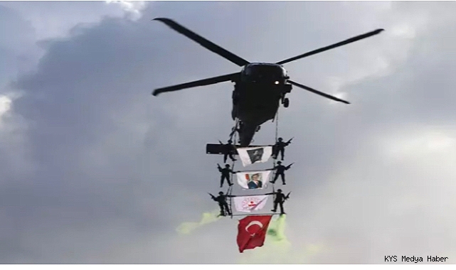 KAYSERİ'de Türkiye Cumhuriyeti'nin 102'nci kuruluş yıl dönümü nedeniyle düzenlenen kutlamalarda; Jandarma Genel Komutanlığı'na ait helikopterdeki komandoların 'üzüm salkımı' gösterisi ilgiyle izlendi.Türkiye Cumhuriyeti'nin kuruluşunun 102'nci yıl dönümü kutlamaları, Cumhuriyet Meydanı'nda yapılan törenle kutlandı. Törene; Vali Gökmen Çiçek, Garnizon Komutanı Hava Pilot Tümgeneral Kadir Can Kottaş, milletvekilleri, belediye başkanları, siyasi parti temsilcileri ve çok sayıda vatandaş katıldı. Coşkulu bir kutlama yaptıklarını belirten Vali Gökmen Çiçek, "Biz tarihi zaferlerle, kahramanlıklarla dolu bir milletin evlatlarıyız. Bizler milletçe çok zaferler gördük. Öyle günler geldi ki; hüzünler, acılar da gördük. Bu coğrafyada Metehan'ın disiplini, Alpaslan'ın cesareti, Fatih'in inancı, Gazi Mustafa Kemal Atatürk’ün kararlılığıyla dimdik ayaktayız. Bizim tarihimizde utanılacak, başımızı yere eğecek tek bir an, tek bir sahne tek bir olay yoktur. Biz ecdadımızla gurur duyan, alnı dik gezen bir milletiz" dediVali Çiçek'in konuşmalarının ardından öğrenciler, halk oyunları gösterileri yaparak, şiirler okudu. Törende çeşitli dallarda başarı elde eden milli sporculara ödülleri verildi. Tören, askeri birlikler, emniyet personeli, diğer güvenlik ve kolluk güçlerine ait personel ve araçlarından oluşan geçit töreni ile sona erdi. JANDARMA SELAMLAMA UÇUŞU YAPTI Tören sonunda ayrıca Jandarma Genel Komutanlığı'na bağlı uçuş gösteri timi, 'üzüm salkımı' gösterisi yaptı. Ankara'dan gelen özel ekibin Cumhuriyet Meydanı’nda yaptığı selamlama uçuşu, kutlamalara gelen vatandaşlar tarafından ilgiyle izlendi. Vatandaşlar, o anları cep telefonları ile kayıt altına aldı
