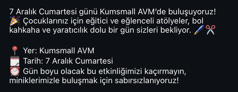 Genel Yayınlanma: 06 Aralık 2024 - 18:09 Kumsmall'da 7 Aralık Cumartesi Günü çocuklarınız için Güzel bir Etkinlik Sizleri bekliyor Genel 06 Aralık 2024 - 18:09 Yorumlar 1 dk okunma süresi TAKİP ET Yazdır A Büyüt A Küçült Yorumlar YORUMLAR adlı kullanıcıya cevap x Gönder İlginizi Çekebilir Erciyes'te 'Kış Spor Festivali' düzenlenecek At izinden şüphelisine ulaşılan çifte cinayette 2 kez ağırlaştırılmış müebbet istemi Başkan Büyükkılıç’tan tarım ve hayvancılığa 132,5 milyon TL’lik yatırım Büyükşehir konservatuvarı 5 bin 655 kişiye hizmet verdi Son Haberler Erciyes'te 'Kış Spor Festivali' düzenlenecek At izinden şüphelisine ulaşılan çifte cinayette 2 kez ağırlaştırılmış... Başkan Büyükkılıç’tan tarım ve hayvancılığa 132,5 milyon TL’lik... Büyükşehir konservatuvarı 5 bin 655 kişiye hizmet verdi Avusturya Büyükelçisi Juen’den Başkan Büyükkılıç’a ziyaret Kumsmall 7-8 Aralıkta Sizleri ikramlarla karşılıyor ! Kumsmall 7-8 Aralıkta Sizleri ikramlarla karşılıyor !
