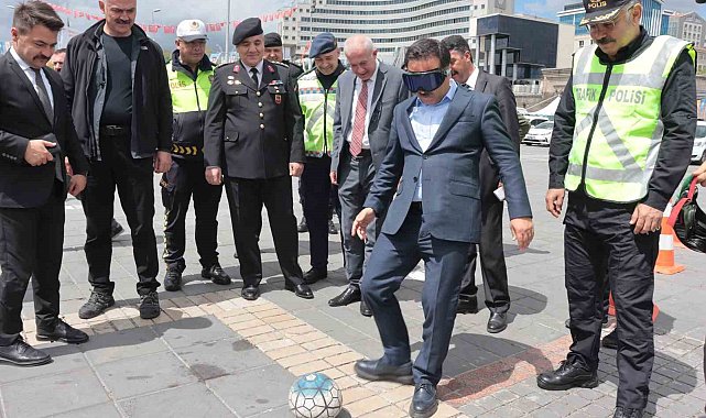 Kayseri'de Trafik Haftası nedeniyle düzenlenen etkinlikte kurşunlanan trafik levhaları sergilenirken, Kayseri Valisi Gökmen Çiçek farkındalık oluşturmak amacıyla alkol simülasyon gözlüğü takarak, kaleye şut çekti.