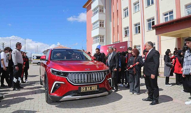 Sivas Belediye Başkanı Hilmi Bilgin, belediye hizmet aracı TOGG'u öğrencilerle buluşturdu.Bilgin, Türkiye'nin yerli ve milli otomobili TOGG ile Sivas Bilişim Teknolojileri MTAL'yi ziyaret etti. TOGG'u büyük bir coşkuyla karşılayan öğrenciler, son teknoloji ile donatılmış akıllı cihaza hayran kaldı. Başkan Bilgin ile TOGG üzerine sohbet eden öğrenciler, Türkiye'nin otomobili ile gurur duyduklarını dile getirdi. TOGG, öğrenciler kadar okulda görev yapan öğretmenleri de heyecanlandırdı. TOGG'un koltuğuna geçerek yerli ve milli akıllı cihazı yakından inceleyen öğretmenler tam puan verdi."Milletimizin emrindeyiz"Okul ziyaretinde öğretmen ve öğrencilerle bir araya gelerek sohbet eden Bilgin, "Cumhurbaşkanımızın liderliğinde TOGG'umuzla, yüksek hızlı trenimizle, Kızılelma'mızla, TCG Anadolu'muzla, silahlı insansız hava araçlarımızla milletimizin emrindeyiz" dedi.Başkan Bilgin daha sonra "TEKNOFEST Liseler Arası İnsansız Hava Araçları Yarışması'nda" 'en iyi performans' ödülüne layık görülen okul takımına hediyelerini takdim ederek başarılar diledi.