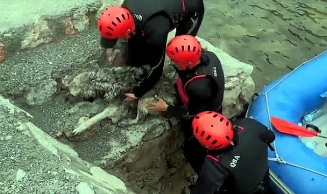 Rafting parkurunda donmak üzere olan köpeğin imdadına sporcular yetişti