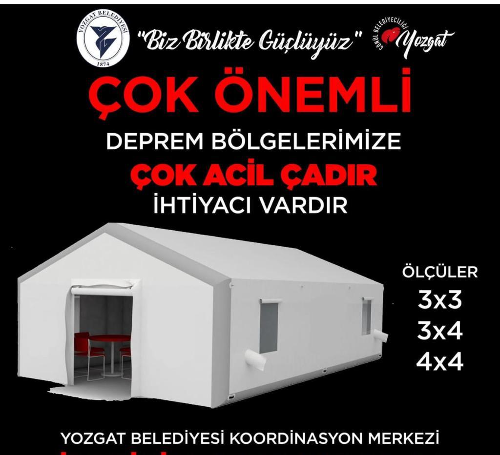 Yozgat Belediye Başkanı Celal Köse sosyal medya hesabından "Deprem bölgelerimize 3x3, 3x4, 4x4 ölçülerinden çok acil çadır ihtiyacı vardır " diyerek duyurdu.
